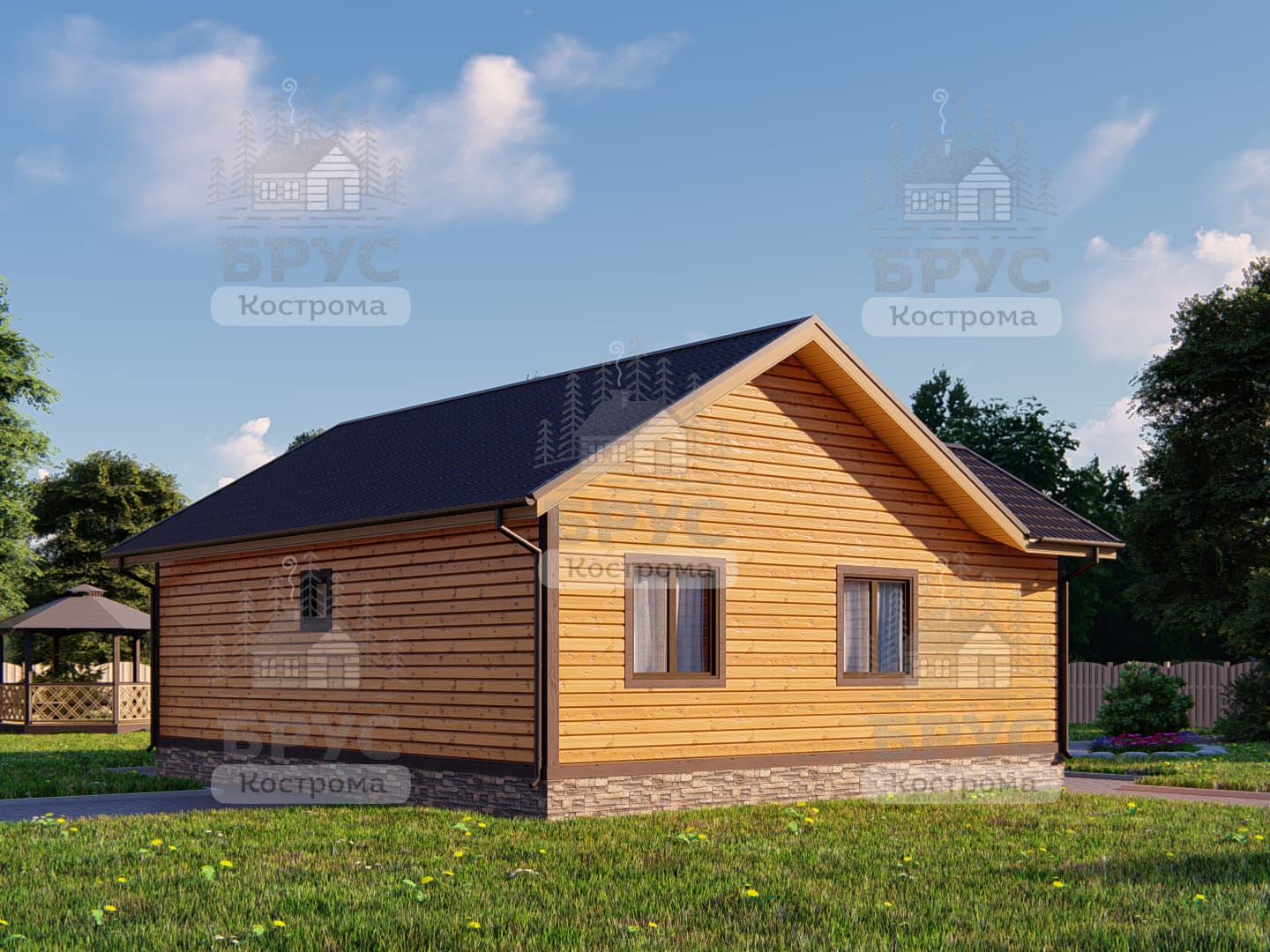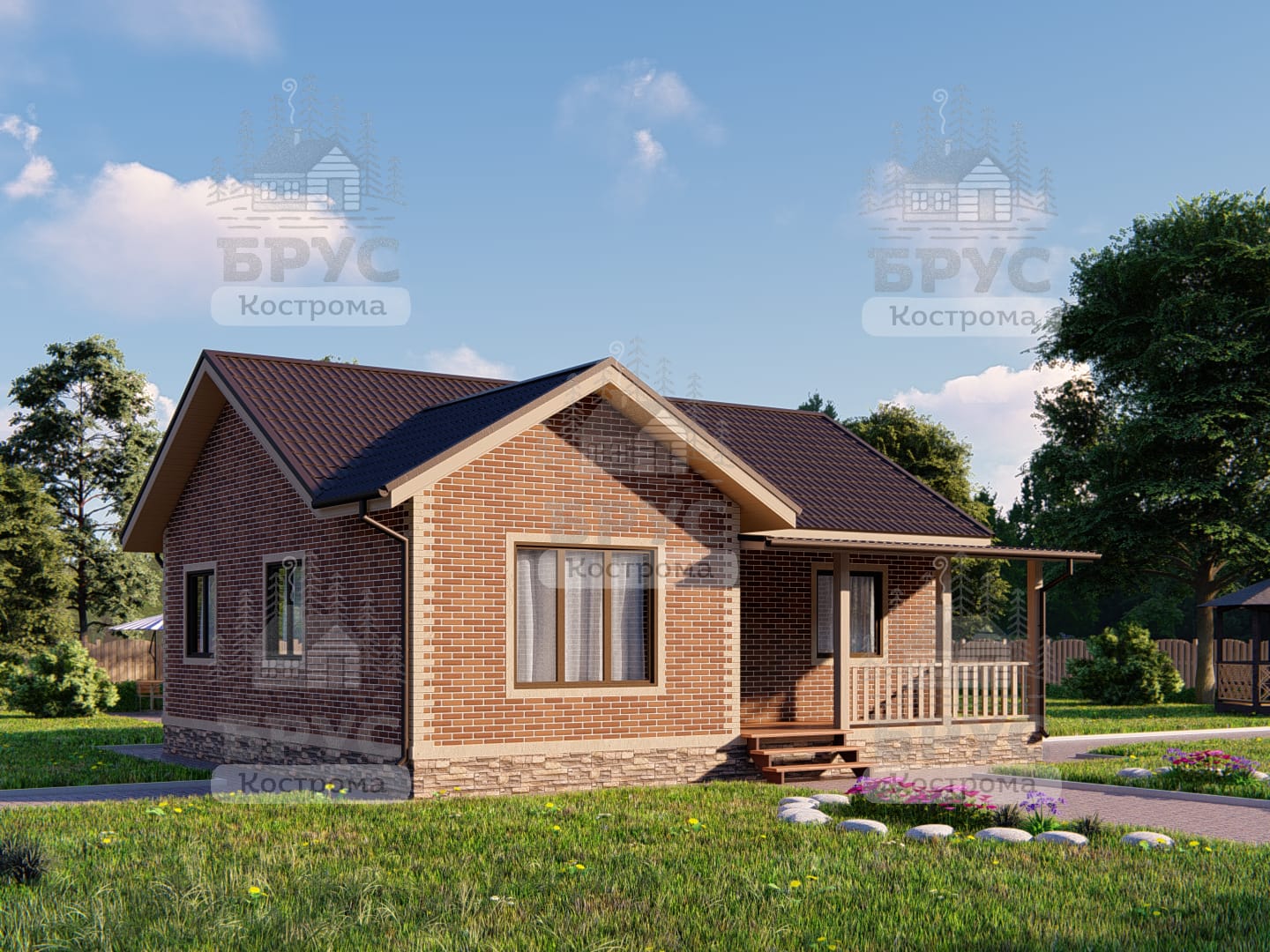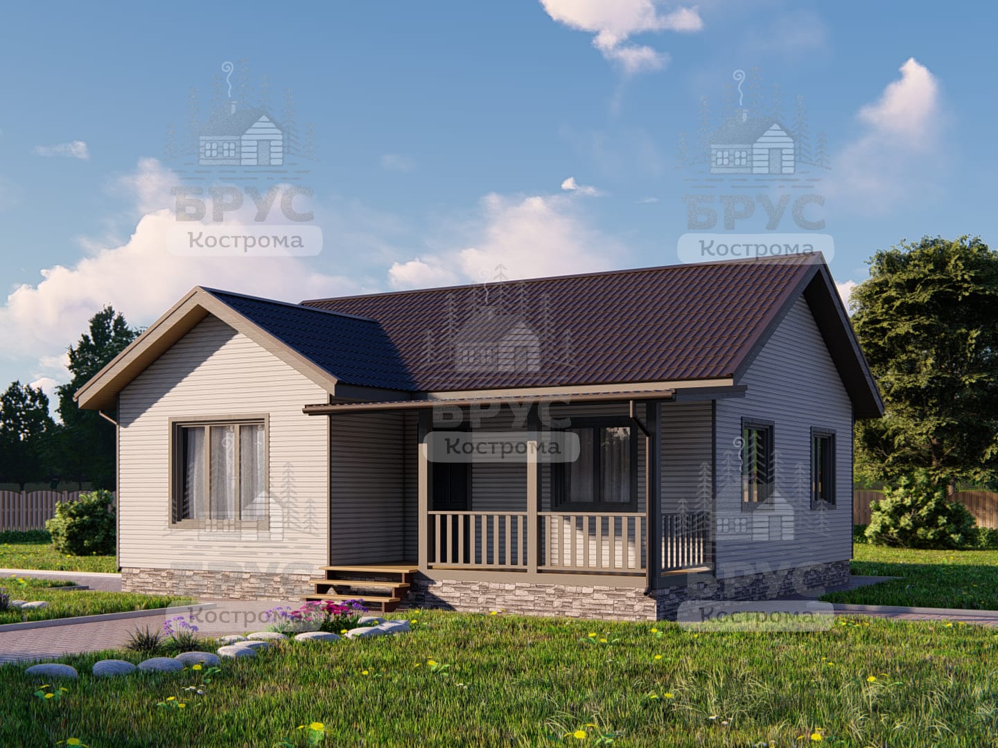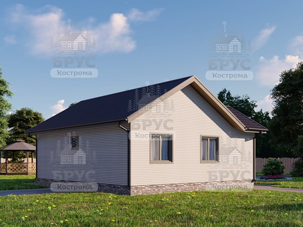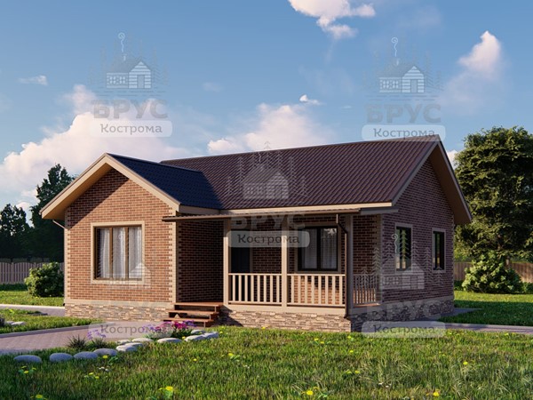 Одноэтажный дом с крыльцом. Двухскатная крыша.