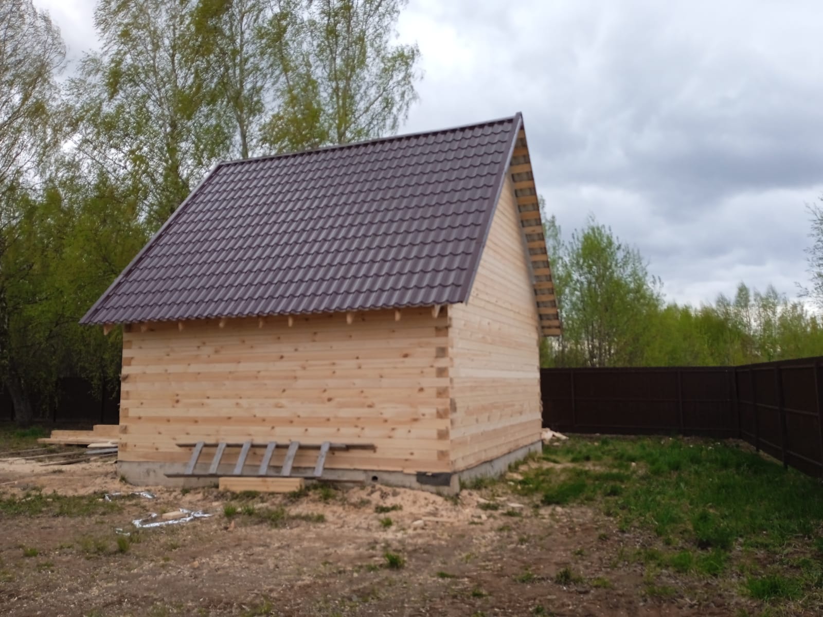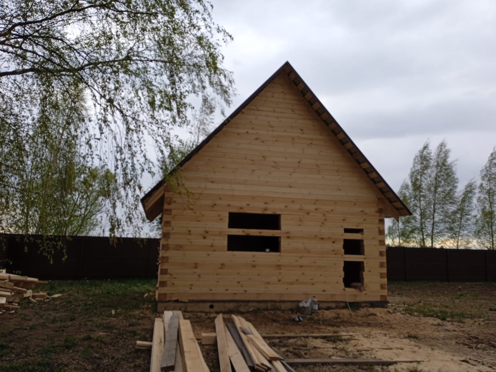 В начале апреля 2022 построили небольшой домик 6 х 6 метров из бруса естественной влажности сечением 150х200 мм в поселке Некрасовское Ярославской области. Остроконечная двухскатная крыша из металлочерепицы, ленточный фундамент.