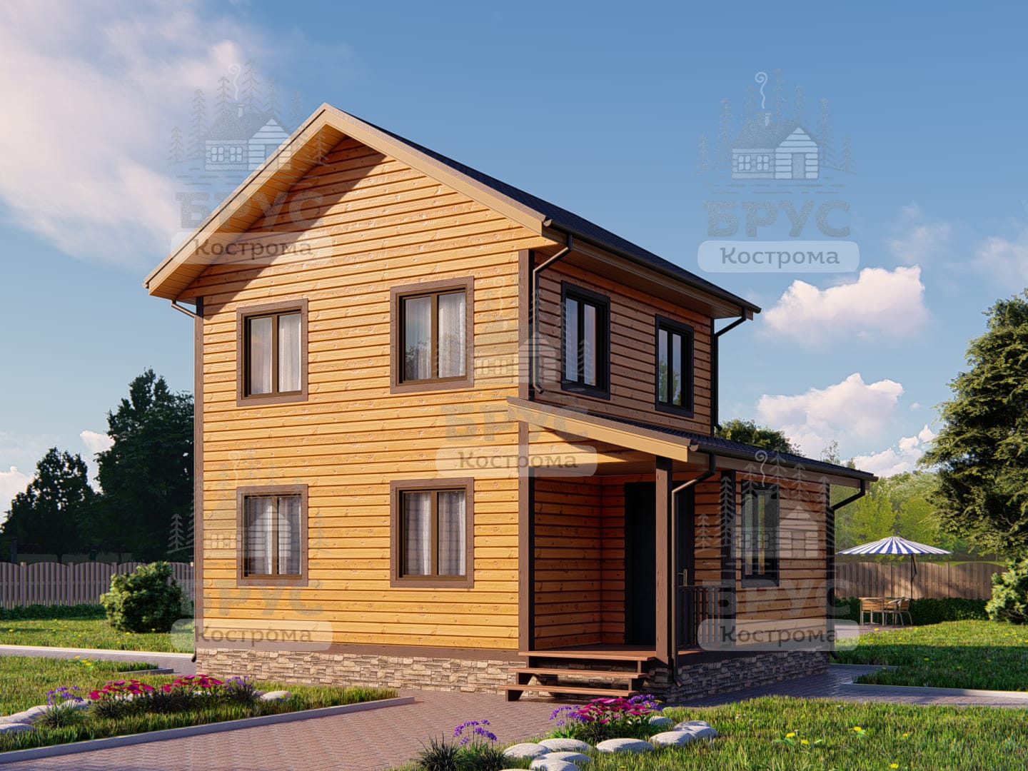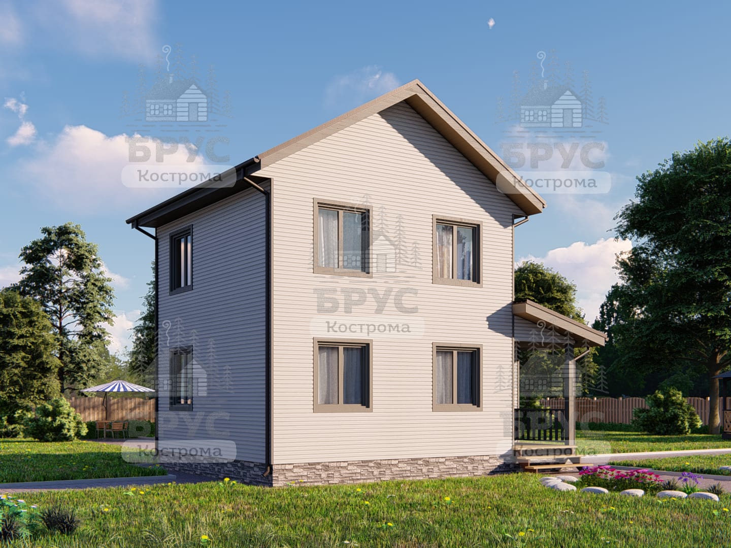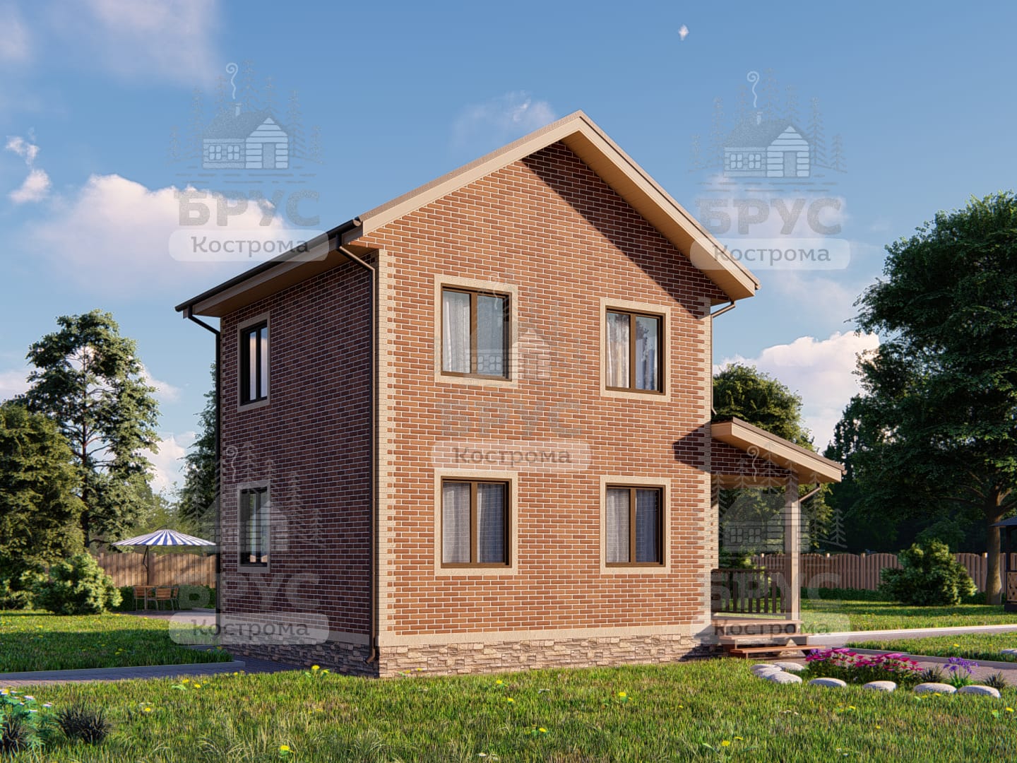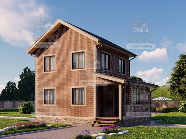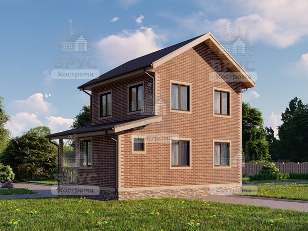 Двухэтажный дом с крыльцом. Двухскатная крыша.