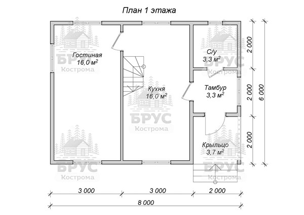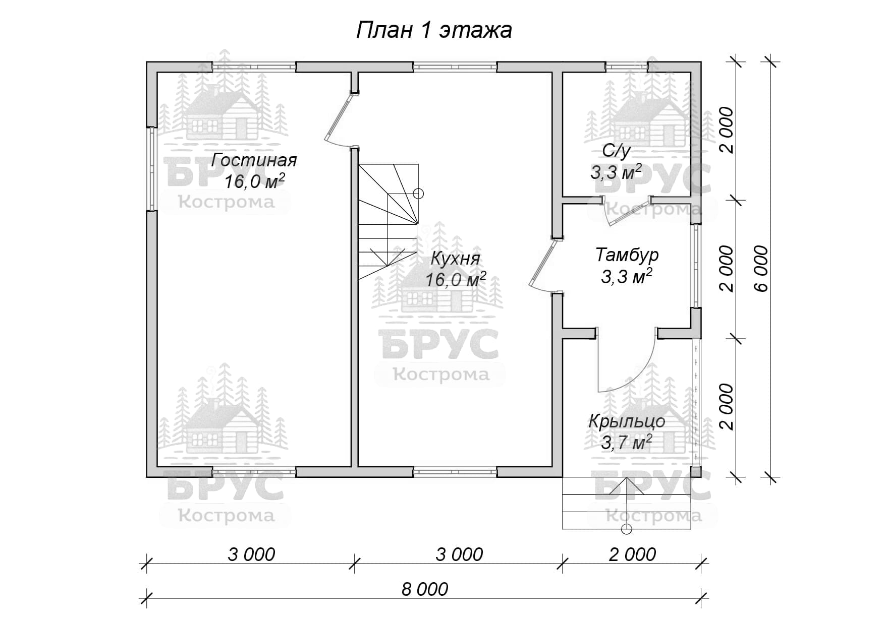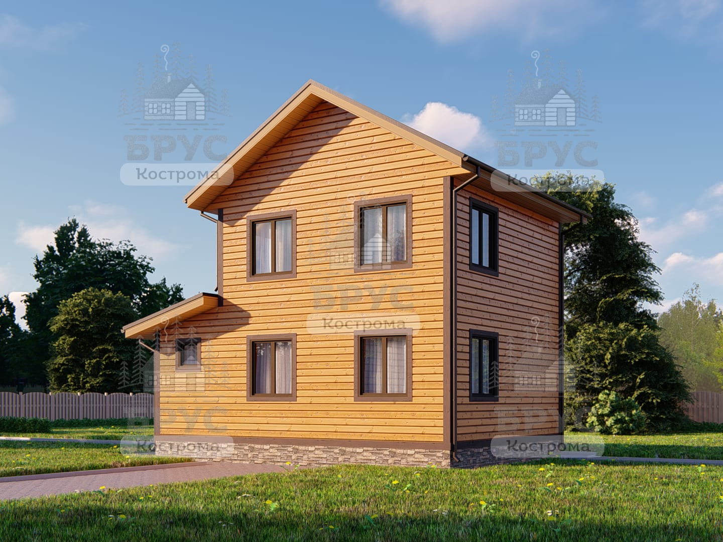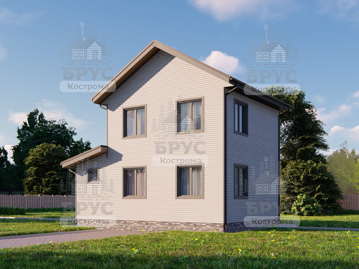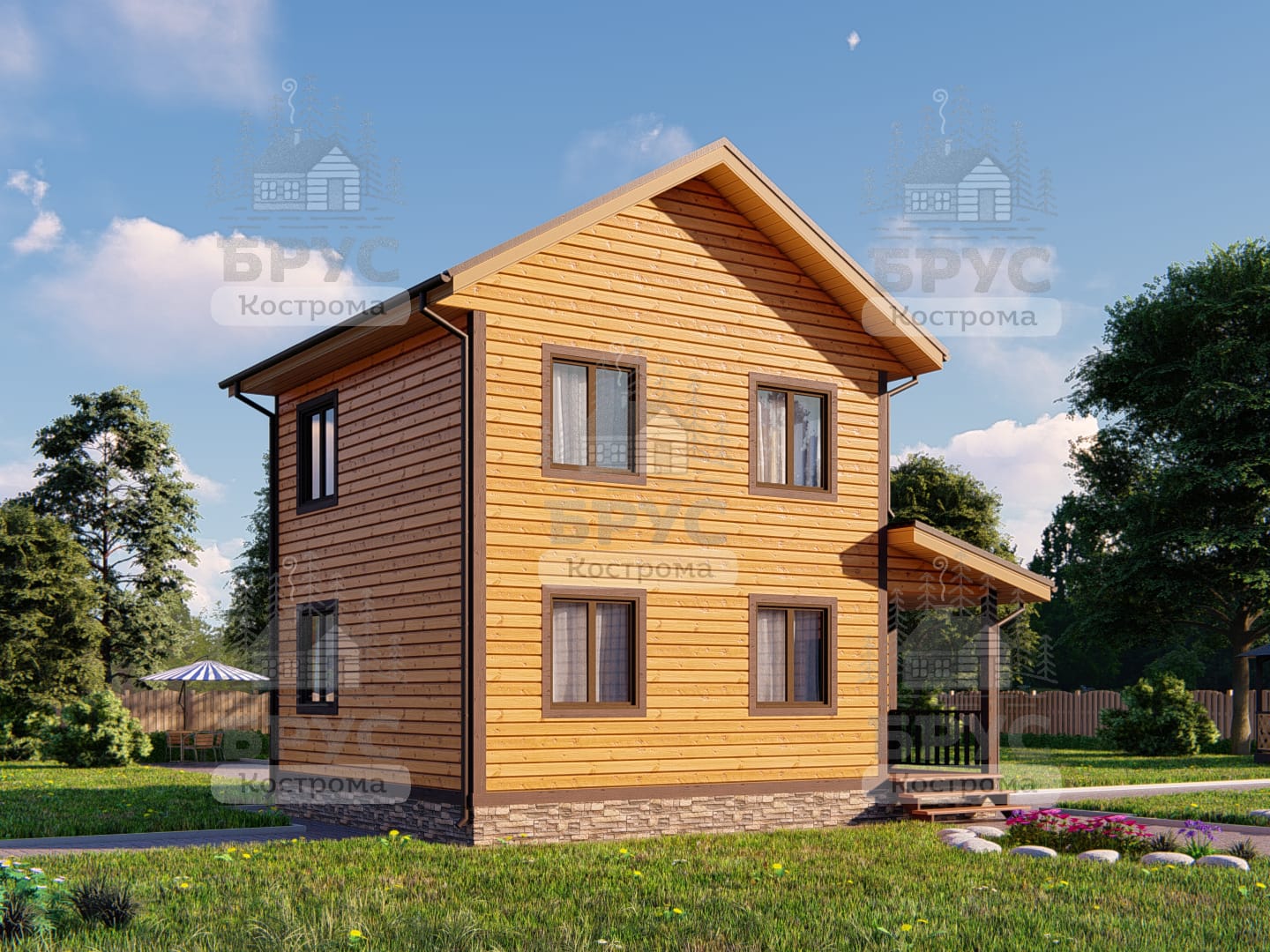 Двухэтажный дом с крыльцом. Двухскатная крыша.