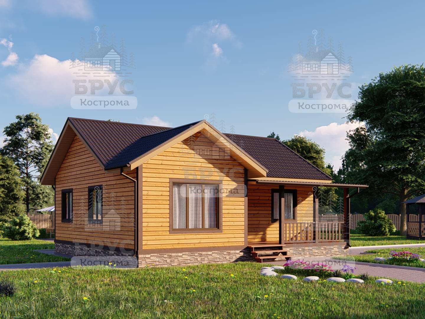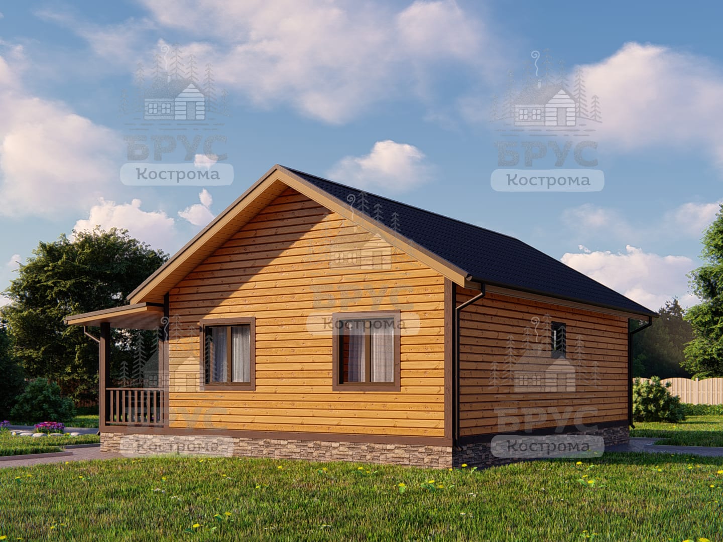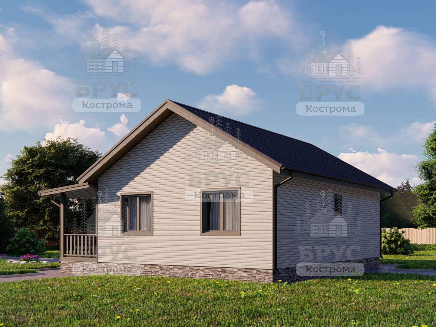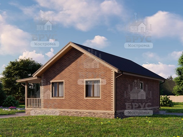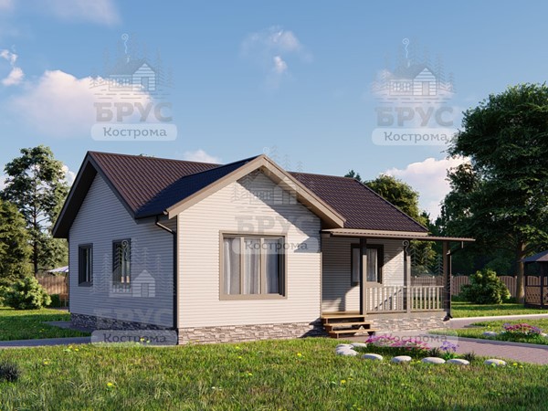 Одноэтажный дом с крыльцом. Двухскатная крыша.