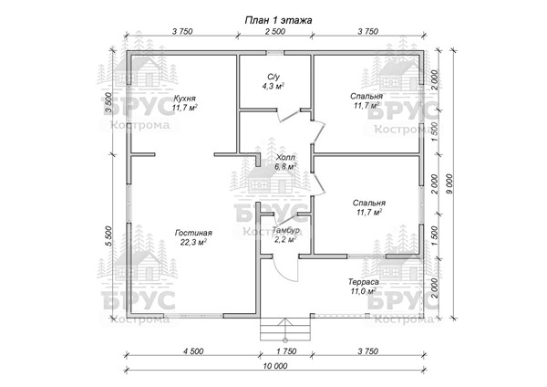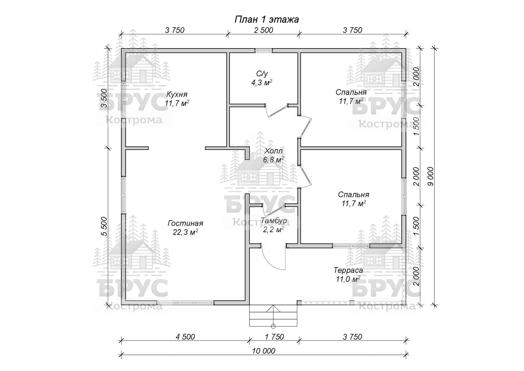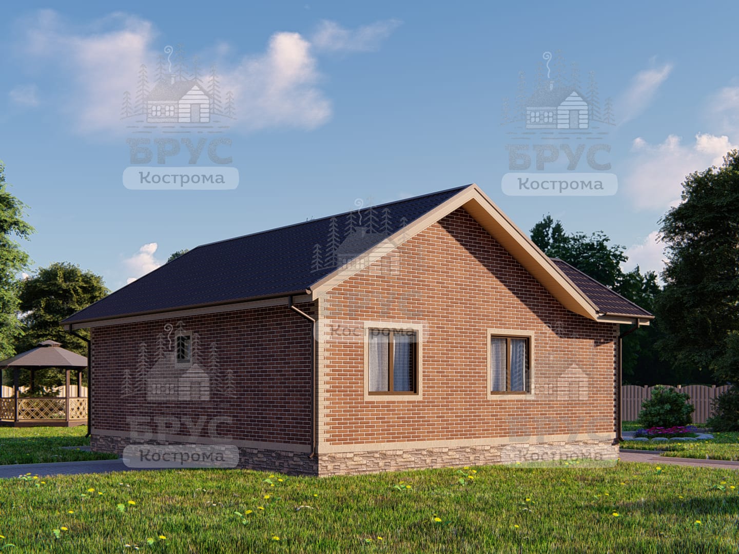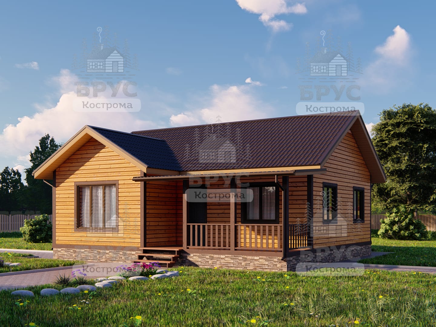 Одноэтажный дом с крыльцом. Двухскатная крыша.