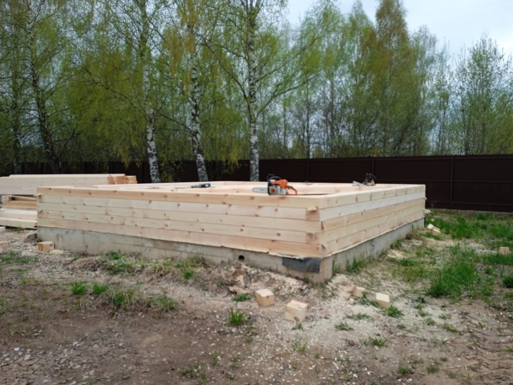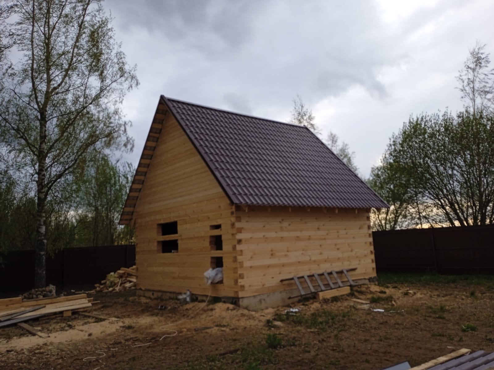В начале апреля 2022 построили небольшой домик 6 х 6 метров из бруса естественной влажности сечением 150х200 мм в поселке Некрасовское Ярославской области. Остроконечная двухскатная крыша из металлочерепицы, ленточный фундамент.