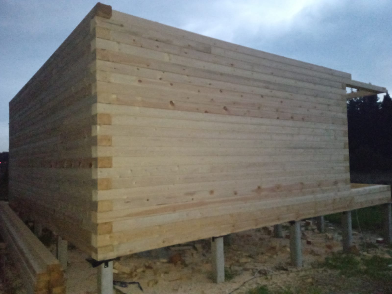 Сдан под усадку дом по проекту ДБ-99. Дом из бруса габариты 8х8 метров, полтора этажа, крыша из металлочерепицы, фундамент - железо-бетонные сваи. Срок возведения около 1 месяца.